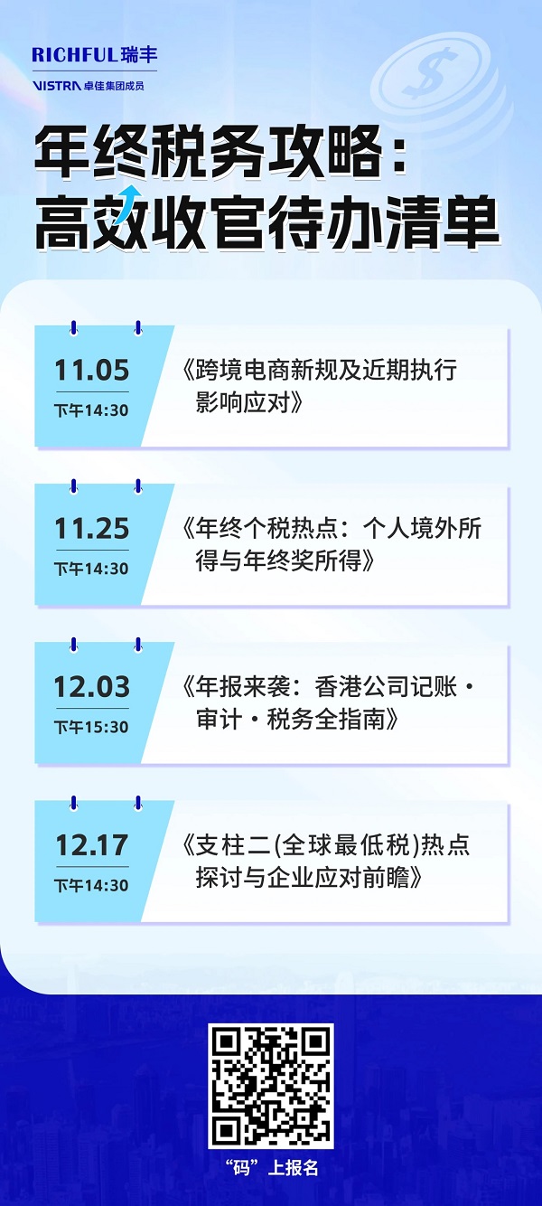 “年終稅務(wù)攻略:高效收官待辦清單”系列網(wǎng)絡(luò)研討會持續(xù)進(jìn)行中,首場已圓滿落幕,干貨滿滿,好評如潮!第二場即將開啟,助你系統(tǒng)梳理關(guān)鍵議題,為2025年穩(wěn)健發(fā)展夯實(shí)基礎(chǔ)。