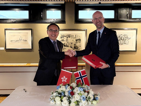 財經(jīng)事務(wù)及庫務(wù)局局長許正宇(左)和挪威駐華大使戴偉恩(右)今日(十二月十六日)在北京簽署全面性避免雙重課稅協(xié)定后交換文件。(圖源:香港稅務(wù)局)
